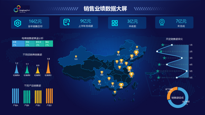 分析结果的最终价值在于指导决策,而看板展示则是连接分析与决策的关键桥梁。永洪的报表分析工具支持数字孪生大屏、个性化报表等多种展示形式,将复杂的分析结果转化为直观的图表、动态数据,色彩丰富、逻辑清晰的展示效果让经营状况一目了然。管理层可通过看板实时掌握核心指标动态,各部门也能快速获取相关数据支持,让决策更高效、更精准。
