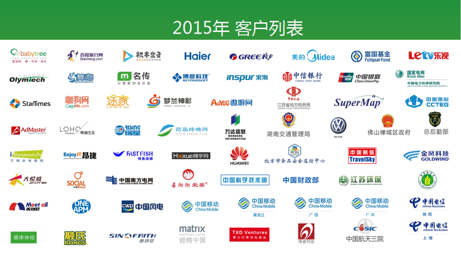这是我们2015年的客户列表,我们总结了一下有这样一个趋势,在2014年我们有一些大型企业成为了我们的重要客户,那么在2015年看到更多的企业变成了我们的重要客户,像海尔、美的、中国移动、中信银行、华为等等。