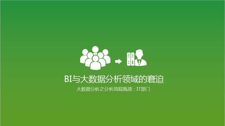 3.在BI与大数据分析领域的第三个窘迫,便是流程问题,其中最大的问题是IT部门。大家可以看到我们这个图画的还是挺形象的。在企业里面有数十个部门的大企业非常多,这数十个部门的数据分析的需求都是提交给一个部门来完成的,这个部门就是IT部门。我们做数据分析时,拜访了很多大型机构、政府机构,它们的IT部门往往有一个特点:加班严重,压力也很大。各个部门对他们的评价都不高,他们觉得IT部门阻碍了他们业务的优化,阻碍了他们进行业务问题症结寻找的进程。但是这个事情其实是不怨IT部门的,这需要整个数据分析平台的构建和整个流程的重构,这是我们作为一家大数据分析企业应该做的事。