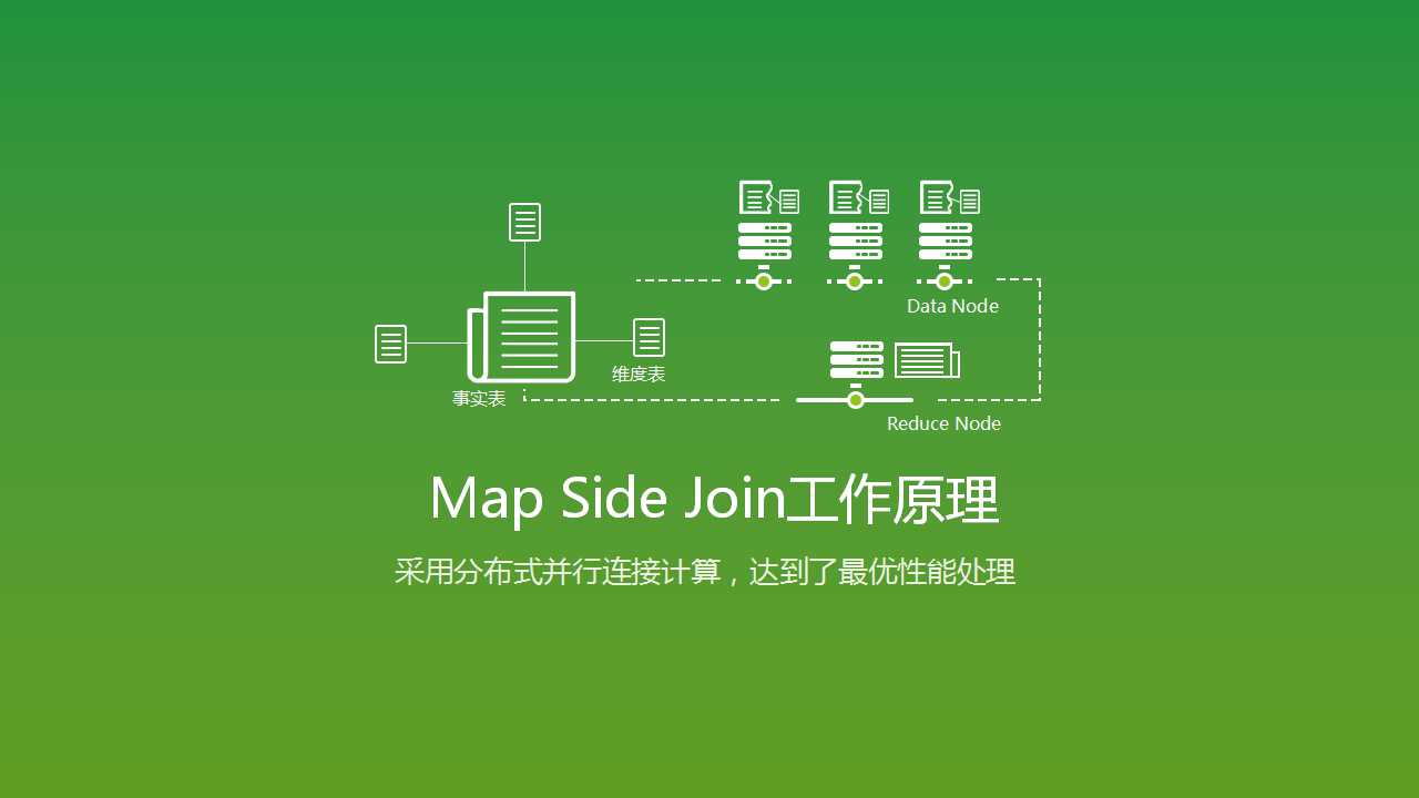 由于当前很多业务系统依然采用关系模型,表连接属于非常普遍的操作。但当数据量达到一定级别,数据表之间的连接操作变得非常难以计算处理。在分布式系统中,可对不同的数据模型进行有针对性的处理,以达到最佳的处理效果。比如在业务系统中普遍存在的星形数据模型,事实表数据量相当大;而维度表通常较小,并且都是些码表数据。我们将事实表数据按块分布在各个Data Node上,而将维度表在每个Data Node上保存一份完整拷贝。这样就能够在各个Data Node上进行连接操作,并把各个连接结果进行归并,形成最终计算结果。这就是Map Side Join,采用分布式并行处理连接运算,达到了最优的处理性能。