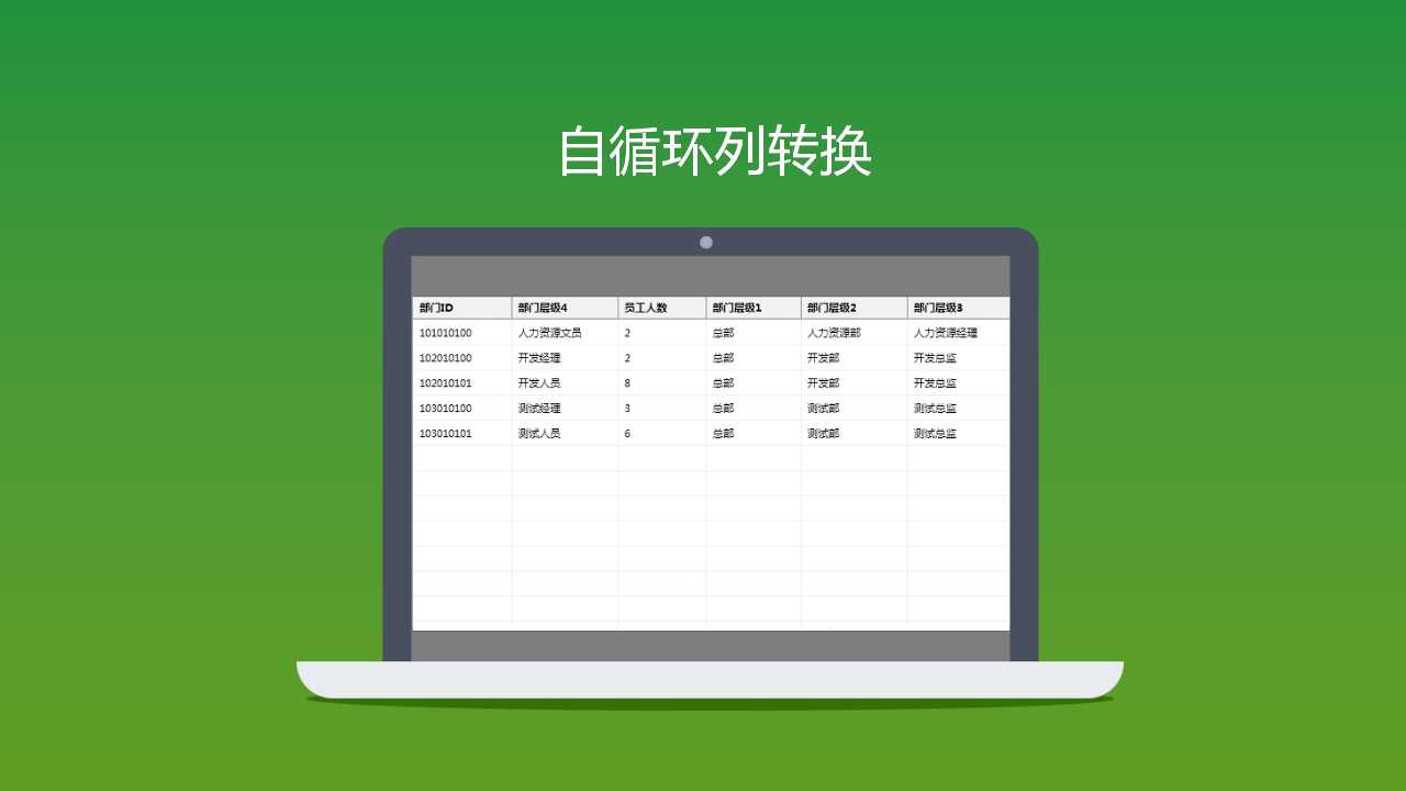 自循环列转换功能:在企业用户中部门结构存在层级关系,这些层级关系往往是依靠关系ID来解读的,无法直接作为维度使用。以前我们只能通过IT人员拼写SQL语句对数据进行转变。在V6.0中我们提供了自循环列转换功能,通过界面简单地设置关系ID及分层列,即可得到部门关系的分层结果,设置过程极为简单易用。