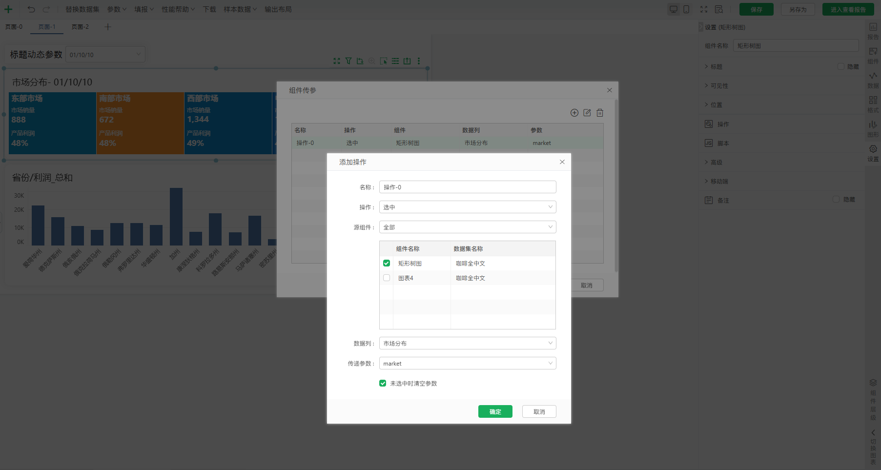 设置组件传参,可以使得通过鼠标点击矩形树图组件与其他图表进行传参联动。