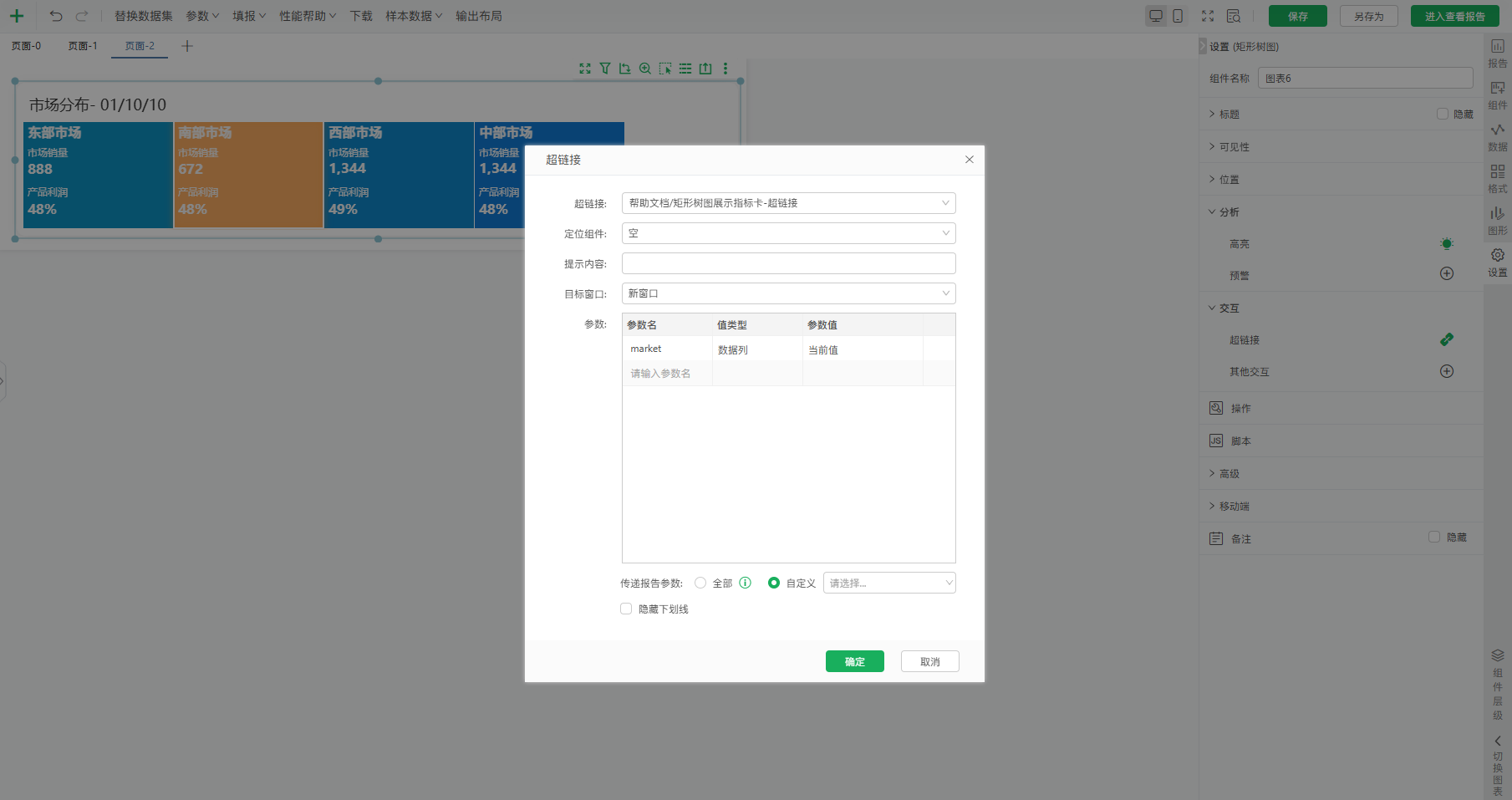 10)在对应的目标超链接报告中,顶部栏【参数>编辑参数】新建参数market,具体内容如下图