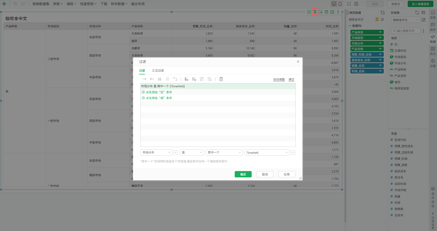 设置好后选择要联动的图表组件,并为其添加过滤条件,具体设置如下图。这样即可实现组件传参联动了。