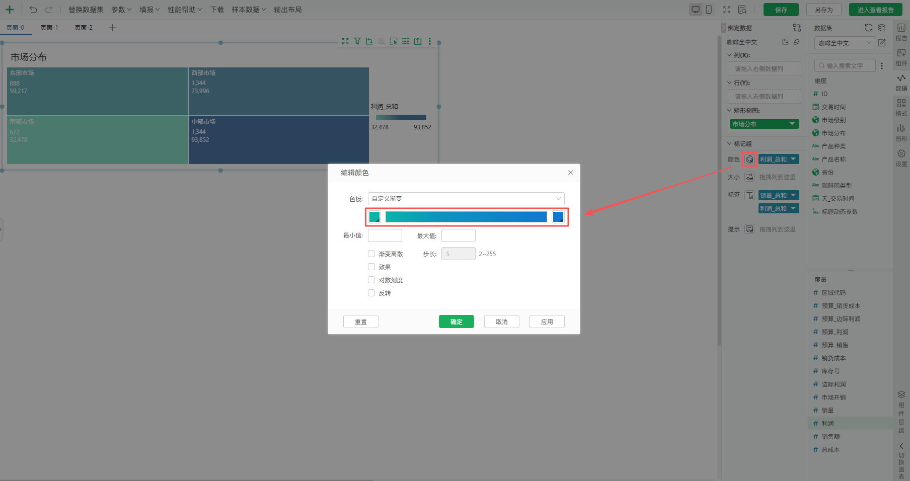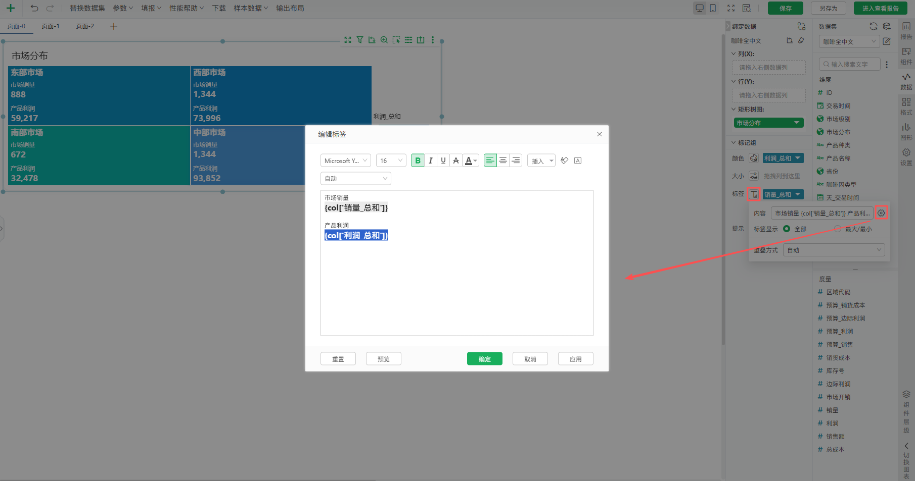 1)拖入矩形树图组件,在【矩形树图】中绑定“市场分布”,在【标记组 > 颜色】中绑定“利润”度量列,【标记组 > 标签】中绑定“销量”和“利润”度量列。
