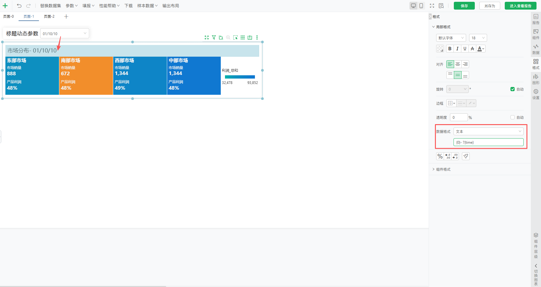 6)在【数据>数据集】更多菜单处点击“新建计算列”,名称输入“标题动态参数”,通过formatDate函数定义时间列格式,formatDate(col['交易时间'],'dd/M/yy')。在报告中拖入下拉参数组件,并将“标题动态参数”列拖入,在【设置>组件名称】改名为time。点击矩形树图标题处,在【格式>局部格式>数据格式】选择文本并在下方输入{0}- ?{time},即可将下拉参数组件值映射到矩形树图标题处,如下图