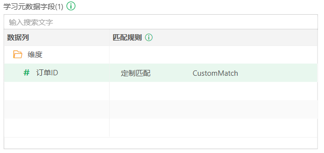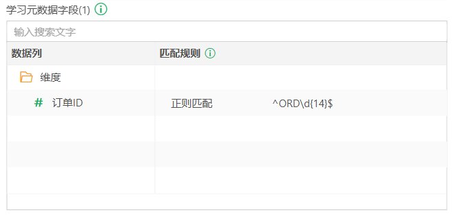 学习元数据字段:所选字段不学习字段值,日期字段和度量字段只支持学习元数据。学习元数据字段支持设置匹配规则,支持正则匹配和定制匹配两种方式。对于维度字段,可以手动选择是否只学习元数据。例如ID类字段、数据唯一值较多的字段均建议选择到仅元数据。对于ID类字段可以设置匹配规则,这样即使只学习了元数据,也可以在提问中直接输入字段值进行提问。如下图所示,对订单ID设置正则匹配规则“^ORD\d{14}$”,则可以直接提问“ORD00000000000001的销售额”,