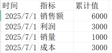 在汇总表中,如果将指标作为单独的字段,指标名作为字段值。如下图,