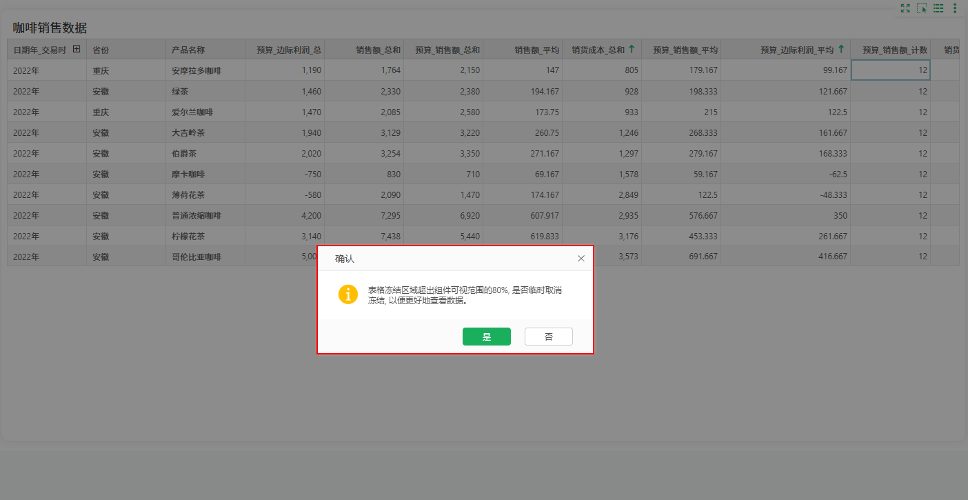 考虑到不同设备屏幕尺寸的差异,当在大屏设备上设置冻结窗格后,若是在小屏设备上查看冻结区域超过了组件可视范围的60%(V11.0~V11.0.2)/80%(V11.0.3)影响浏览体验,可选择临时取消冻结,冻结区域变为可滚动区域,可浏览表中的所有数据,不遗漏任何重要数据。临时取消冻结只是对当前显示的设备做适应性调整,不会影响原本大屏设备上设置的冻结区域,若是在大屏设备上查看,固定区域将自动恢复,继续为您提供便捷的数据对比功能。