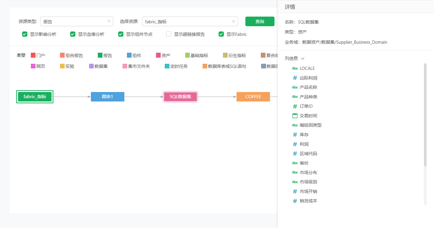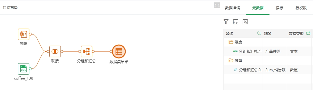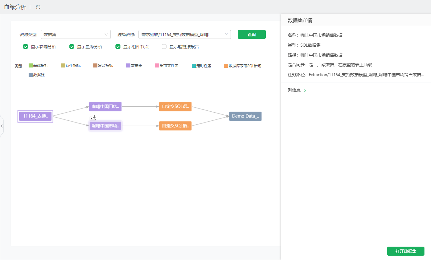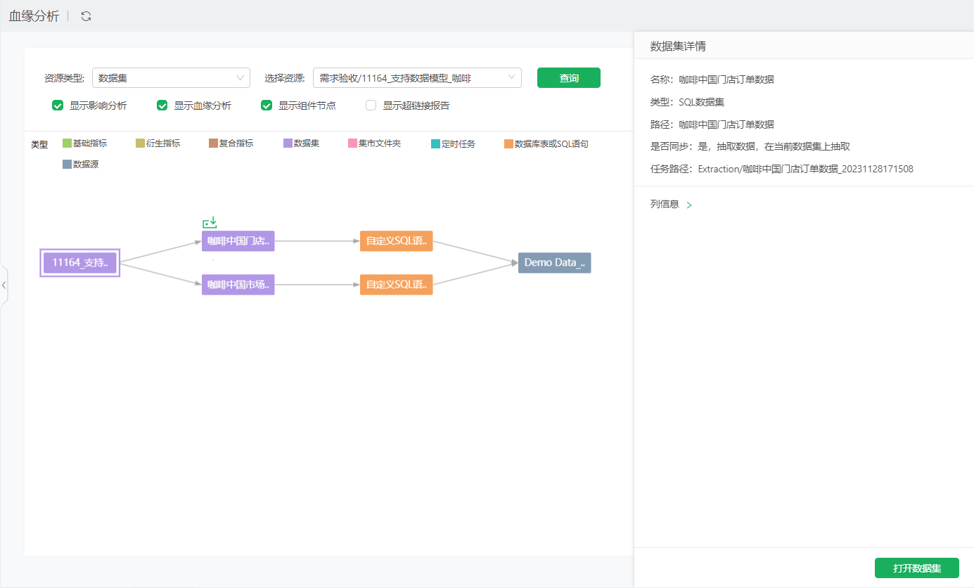 包括名称、类型、路径;如果设置了抽取数据,节点上会显示抽取图标,右侧会显示“是否同步”和“任务路径”;引用详情:可以查看当前查询血缘的资源被其它哪些资源使用;列信息:当前数据集有哪些列,用到了源数据集节点的哪些列;数据集设置了抽取数据,则会显示。对于自服务数据集,凡是中间节点参与计算的列,都会显示到对应的源数据集节点下,包括源数据集节点抽取数据选择追加时用到的更新依据列。点击右下角的打开数据集,可跳转至数据集模块查看、编辑。 下图可以看到“血缘-join”自服务数据集有“Sum_销售额”和“产品种类”字段,用到了“咖啡”数据集的产品种类、订单ID、销售额字段;用到了“coffee_138”数据集的订单ID字段。 “血缘-join”自服务数据集制作如下:其中订单ID为联接节点的联接列,分组和汇总节点用了“咖啡”的“产品种类”和“销售额”字段。 Excel数据集还包括Excel文件路径。 数据模型节点对应的数据集被抽取后显示抽取图标和抽取信息。 数据模型节点被抽取后显示抽取图标和抽取信息。