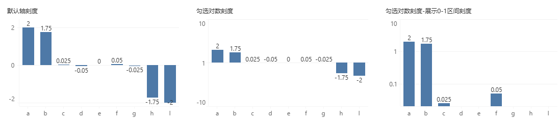 【展示0-1区间刻度】该选项是在“对数刻度”勾选后才显示。勾选后可展示对数0-1区间的刻度,此时不支持展示数据值为负数的标记。轴刻度中最大值和最小值处输入小于等于0的数值时绘制不起作用。