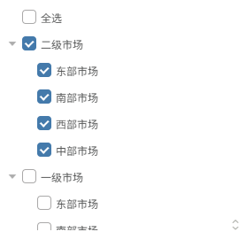 2)默认情况下,树状过滤的父节点需要主动勾选。即上图中,勾选二级市场下的“东部市场、南部市场、西部市场、中部市场”,二级市场仍然是半选状态。如果想要后续数据增加/减少时,仍然查看二级市场下的所有数据,则需要主动勾选二级市场。