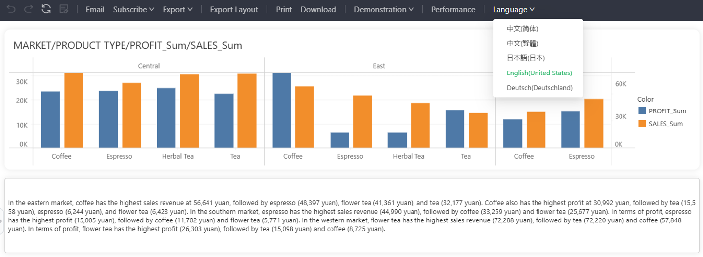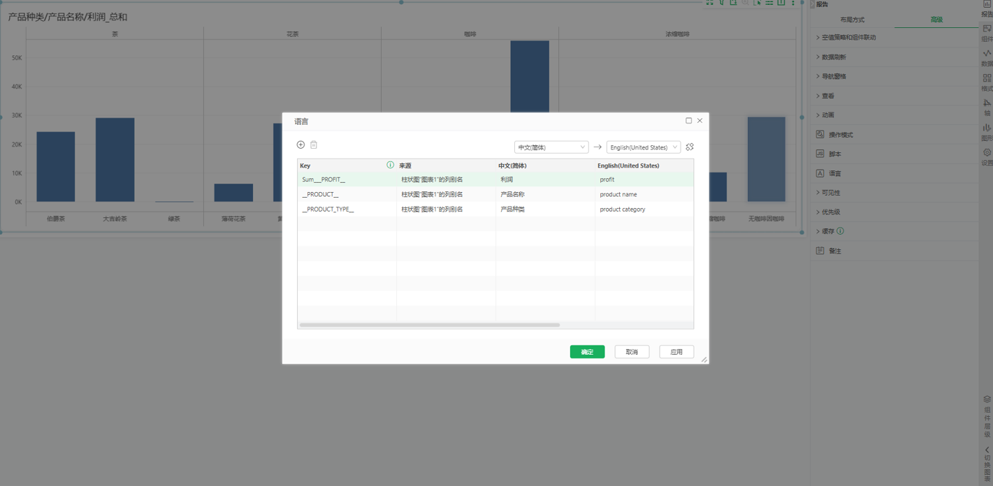 对于报告中的描述性文本(如标题、文本内容等),支持多语言配置功能,用户可为每种语言设置对应的描述内容。当切换语言时,系统自动加载该语言下配置的文本内容,实现不同语言下的描述性语言的切换。