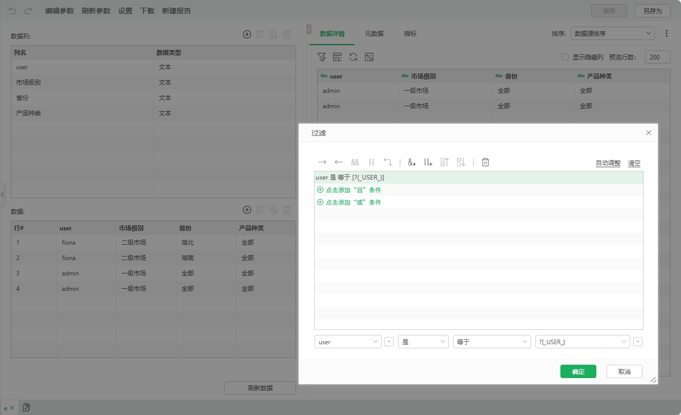 【过滤条件定义】支持同源和多源过滤条件设置,过滤条件设置参考过滤。其中多源过滤指定义字段等于另一个数据集的字段,参考本章的“应用举例”部分。