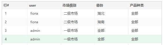 示例二:用户1看到省份为湖北的数据;用户2看到省份为湖南的数据,其它所有人看到空数据