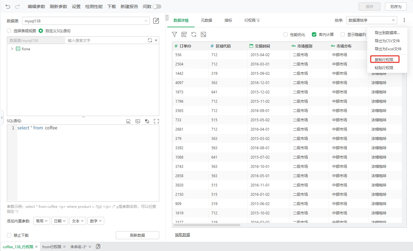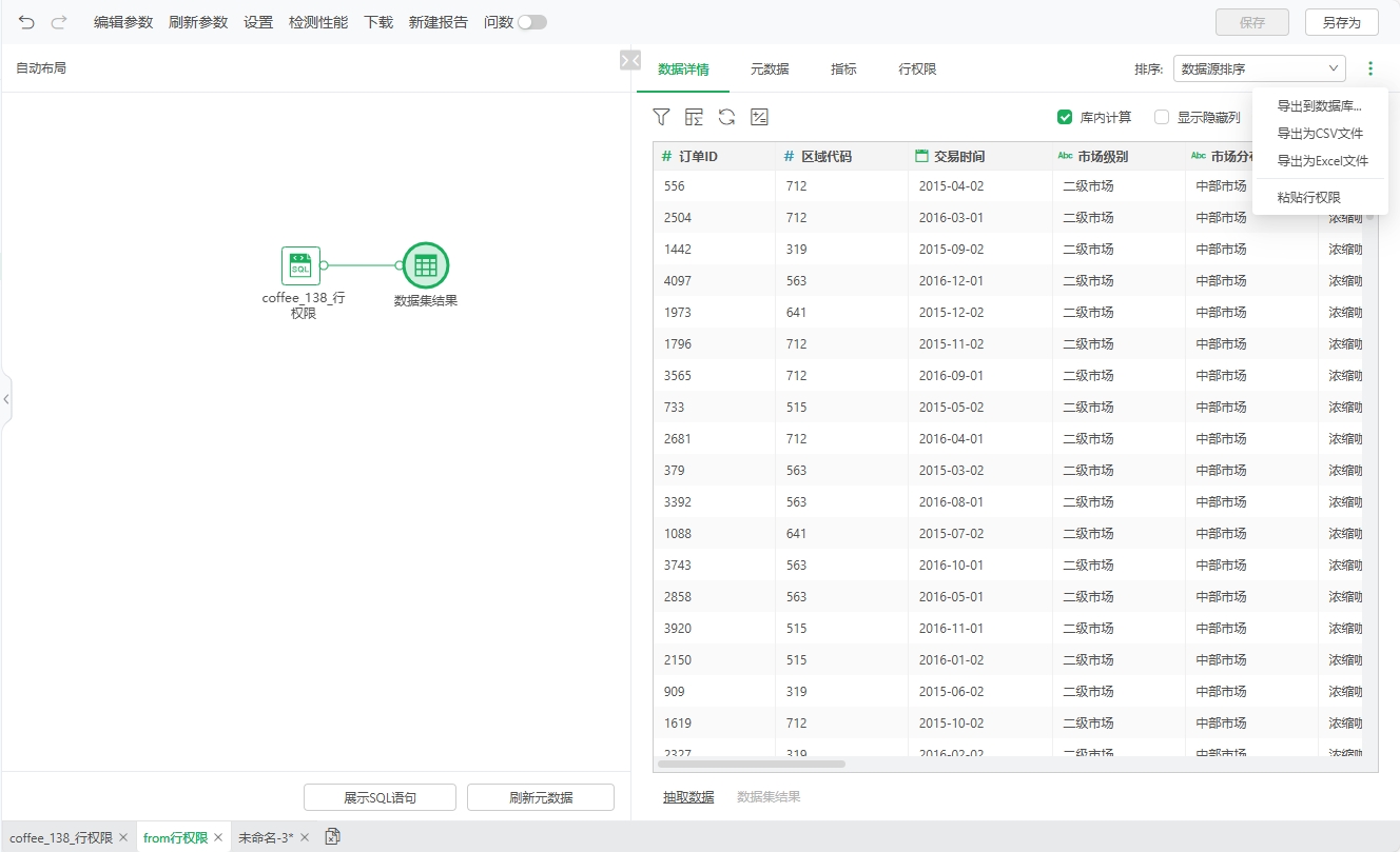 8)一个数据集上设置了行权限,将此数据集拖入自服务数据集或数据模型,行权限不再应用,需要重新设置行权限。也可以将一个数据集上的行权限进行复制,粘贴到另一个数据集上,或粘贴到数据模型的某个节点上。