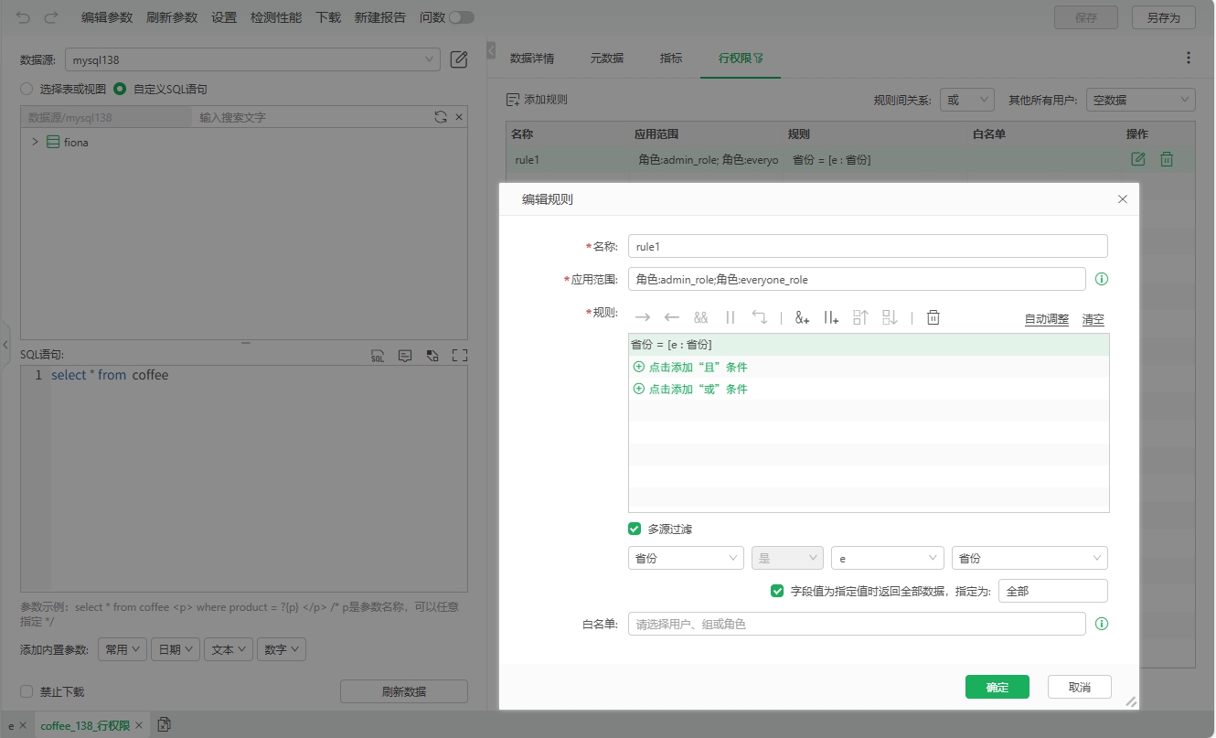 点击“添加规则”,弹出“添加规则”窗口。在“编辑规则”窗口中,输入规则名称;选择应用范围,此例中选择admin_role和every_role的角色应用到所有用户;规则中点击添加条件,选择多源过滤,用省份字段过滤,使其等于数据集“e”的省份字段,并勾上“字段值为指定值时返回全部数据,指定为”,输入“全部”,这样当返回指定的数据“全部”时,此数据集能返回全部数据。