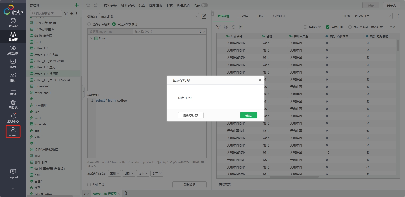 以admin查询数据,数据权限表省份返回“全部”,所以应用行权限之后,显示全部数据。