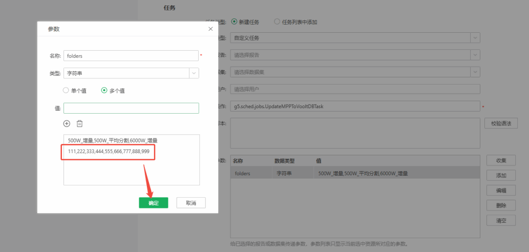 6)点击“编辑”参数,默认多个值,输入框输入集市folders,以英文逗号隔开,点击加号,保存。