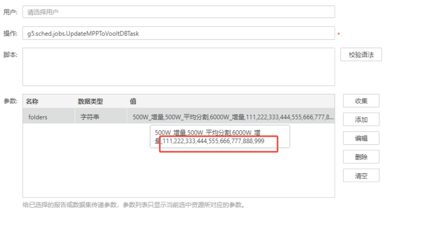 用户点击收集按钮即可收集当前选择的报告或数据集中的所有参数,包括参数的名称、参数数据类型以及参数值。当用户需要添加参数时,点击添加按钮,弹出参数对话框,用户可设定参数的名称、参数的数据类型以及参数值。用户可以按照需求添加单个参数、多个参数或空。