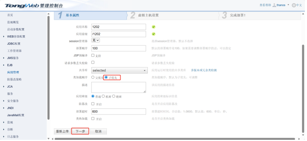 c)点击【开始部署】,配置“基本属性属性”,对应用名称等进行修改,也可使用默认。类加载顺序需选中“子优先”。