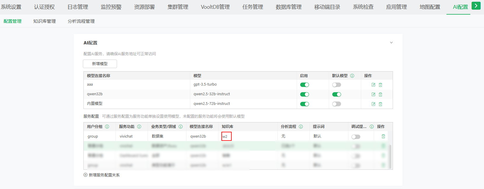 “AI服务配置”修改为“AI配置”,并增加子菜单:配置管理、知识库管理,其中配置管理即之前的AI服务配置。支持多知识库管理、词条增删改查、数据集关联以及更友好的编辑方式,使其更适用于业务分析场景。