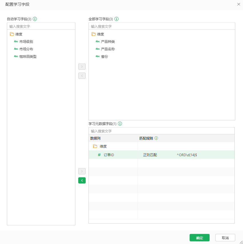 •学习元数据字段:所选字段不学习字段值,日期字段和度量字段只支持学习元数据。学习元数据字段支持设置匹配规则,支持正则匹配和定制匹配两种方式。对于维度字段,可以手动选择是否只学习元数据。