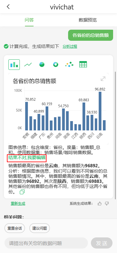 o结果支持编辑:若智能问答Copilot结果不对,用户可点击“结果不对,我要编辑”,调整提问后,重新生成问答结果,持续不断调整提问,直至结果正确。