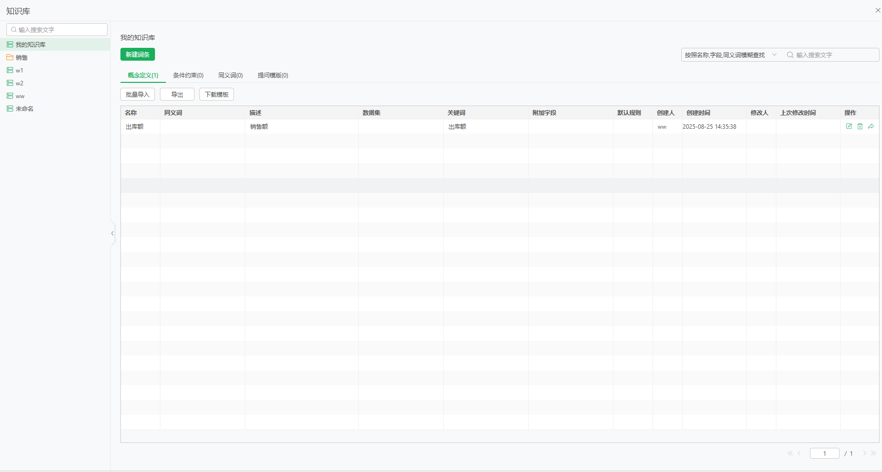 知识库中,支持下载词条模板,也支持Excel批量导入满足模板要求的词条,还支持将创建好的词条导出等。