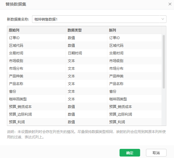 参数列对话框中左侧的数据列按维度、度量分类展示。
